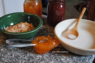 #11 Immediately spread the pastries with jam or jelly or your choice. I happened to have a batch of summer strawberry and peach jam on hand. Sprinkle with coconut or your choice of toasted nuts. The puff will start to sink in as you apply the jam, that's by design, it's okay!